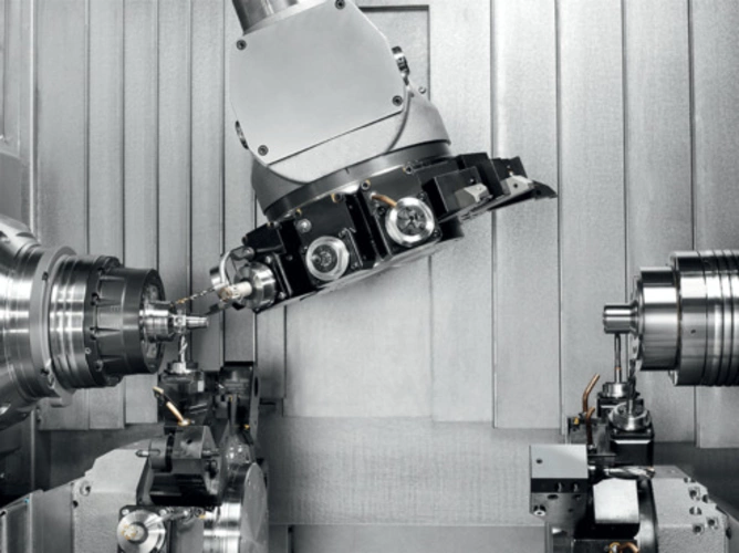 In addition, the vertical work area concept with up to three tool carriers and a milling spindle enables optimum process reliability with minimum set-up costs thanks to the convenient tool supply of up to 43 stations in total (42x VDI25 and 1x HSK-A40).